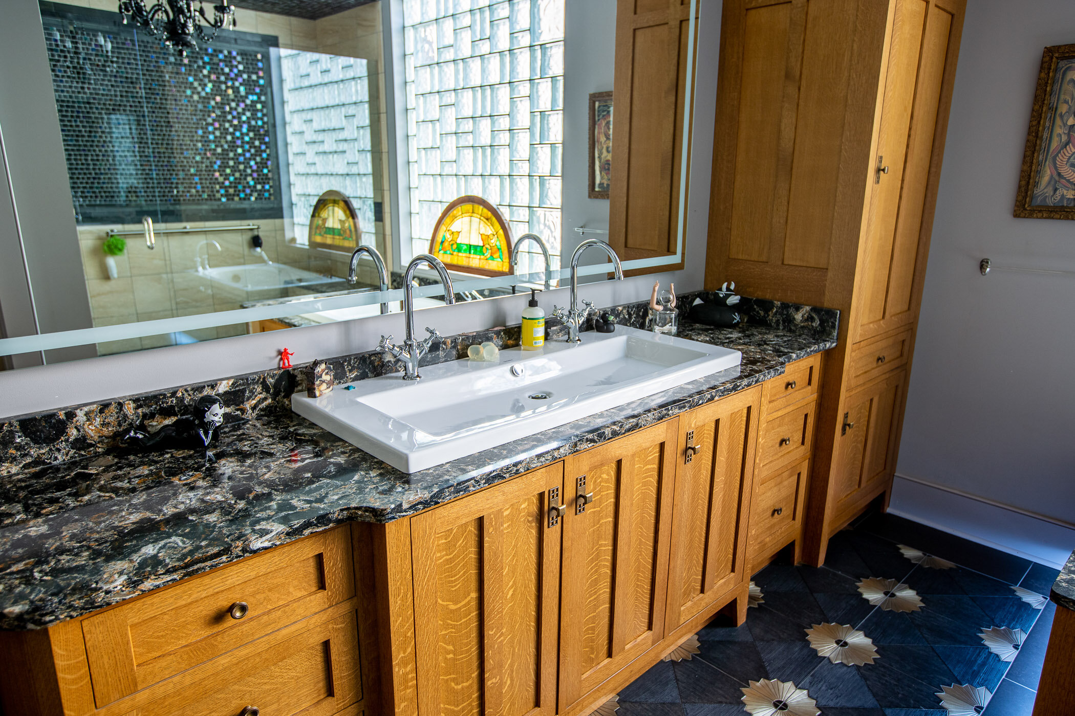 This master bathroom stands out for a variety of its looks, which made it key to ensure that the cabinets could add to the overall composition of the design. Quarter sawn white oak delivers an amazing texture in this craftsman style vanity, cabinet, and tub wrap. The design is made to look clean, and the built-in docking drawer allows easy access to hairdryers and anything requiring power without leaving it to clutter the counter space.